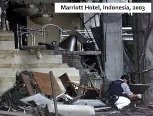 The intentional use of setting fires to trap and generate casualties is a low-tech, easily executable technique. When used in a high-rise building, a fire on one floor could trap everyone on higher floors until the fire is controlled. What about the fire suppression systems required by fire code? The systems are not hard to control nor disable when access is directly behind a visible door in the lobby.