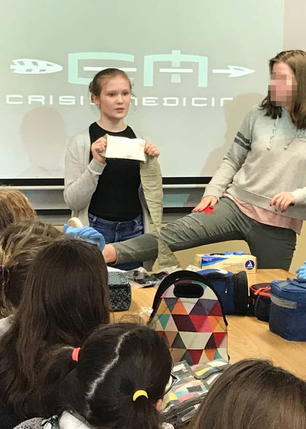 Once I had the list of skills I wanted to teach, I started figuring out how I was going to teach them. I knew that teaching kids meant including interactive activities, games, and not just boring lecture. I borrowed the necessary medical training supplies from my dad’s company, Crisis Medicine, and began practicing applying bandages and tourniquets to make sure that as I was teaching, I could show the students as smoothly and properly as possible.