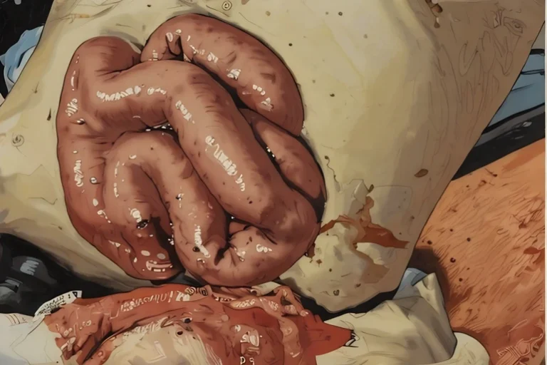 →Image at top is an artistic rendering from a 14-year-old boy who sustained a penetrating injury to his abdominal wall after impacting the handlebars of his bike. Note the bowel perforation at approximately 7 o’clock on the bowel. This should not be reduced, as it will spill bowel contents into his abdomen. 5