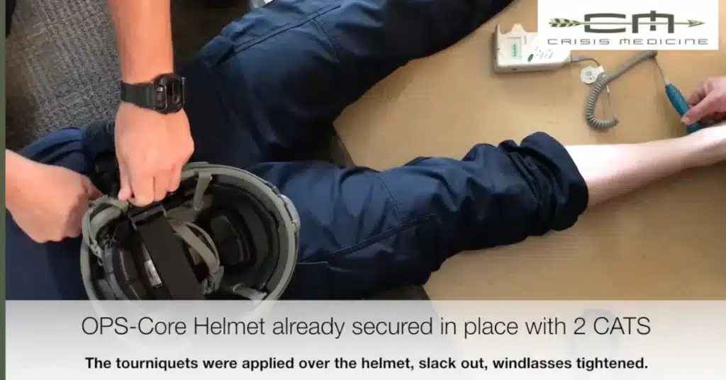 An OPS Core Helmet or Cairns Fire Helmet used to stop junctional hemorrhage with two CAT tourniquets.