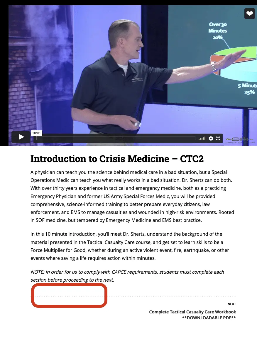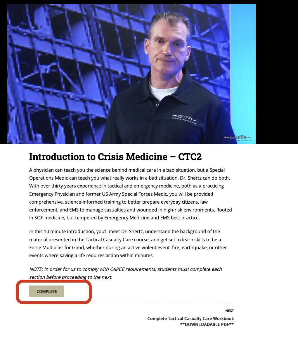Because we are required to use “drip content” for our accreditation, students must complete each lesson before continuing to the next. However, if you have accidentally clicked “Finish Course” before you’re done, you will not be able to watch videos past that point and mark them complete. This is a frustrating and unintended consequence, so if you find yourself in this position, please email us right away so we can reset the system . logistics@crisis-medicine.com