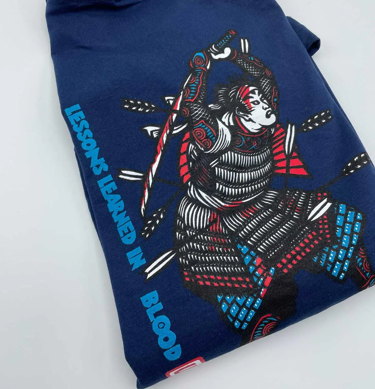 • The back of the Samurai t-shirt showing a Samurai, bloodied in battle, broken sword raised, and shot up with arrows, but continuing to fight